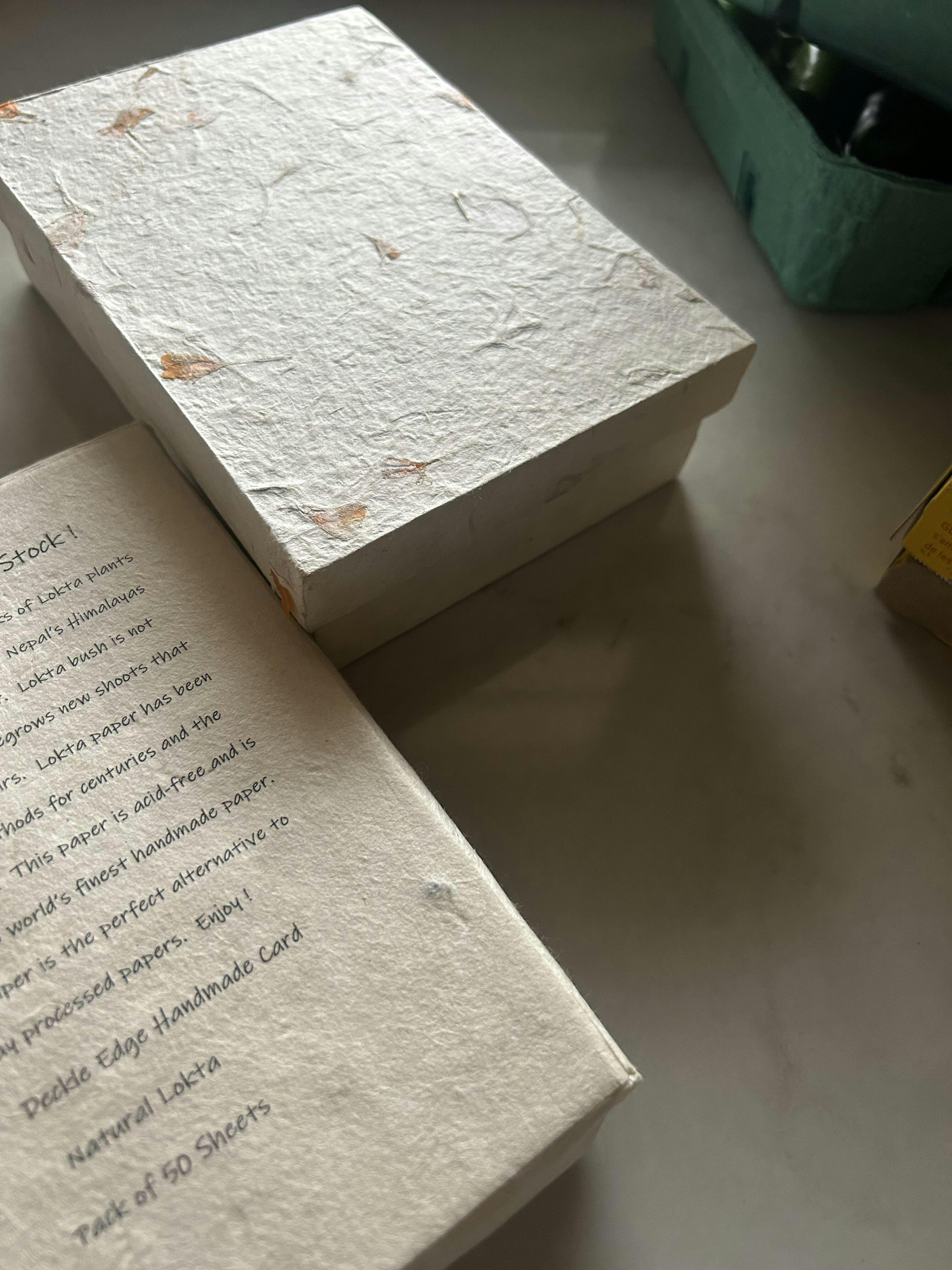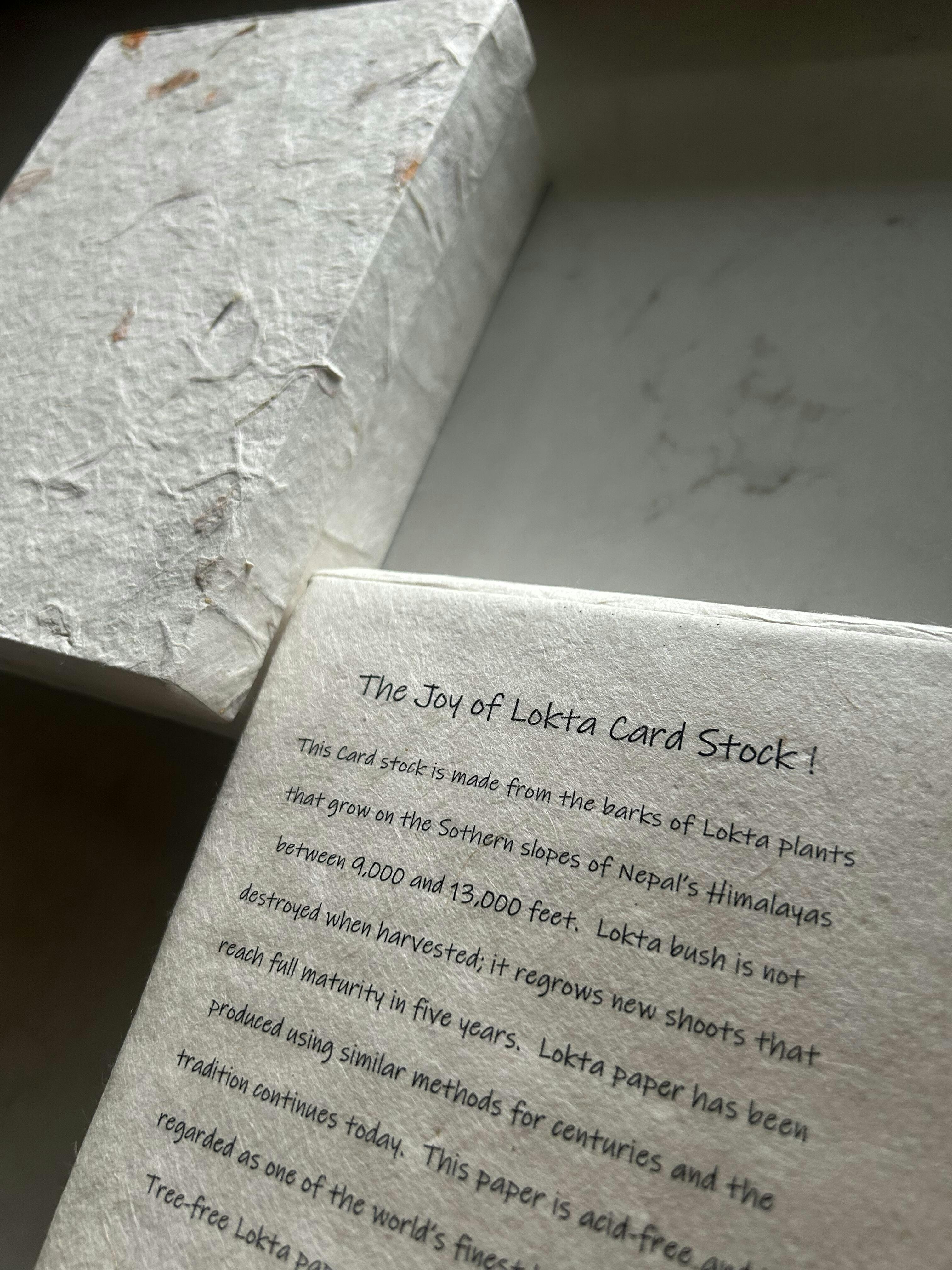 A set of 15 cards and 15 envelopes made from the barks of lokta plants that grow on the southern slope of Nepal’s Himalayas between 9,000 and 13,000 feet.